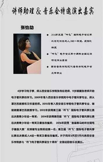 本次活動,除了精彩的師資培訓外,主辦方還特別安排了一場精彩地音樂會活動。音樂會上特別邀請到張怡劼作為音樂會的演出嘉賓,張怡劼在西安音樂學院跟隨譚藝民教授學習電子管風琴。多次在國際比賽中拔得頭籌~培訓過程中她也擔任了講師助理協助馮捷老師共同完成授課。