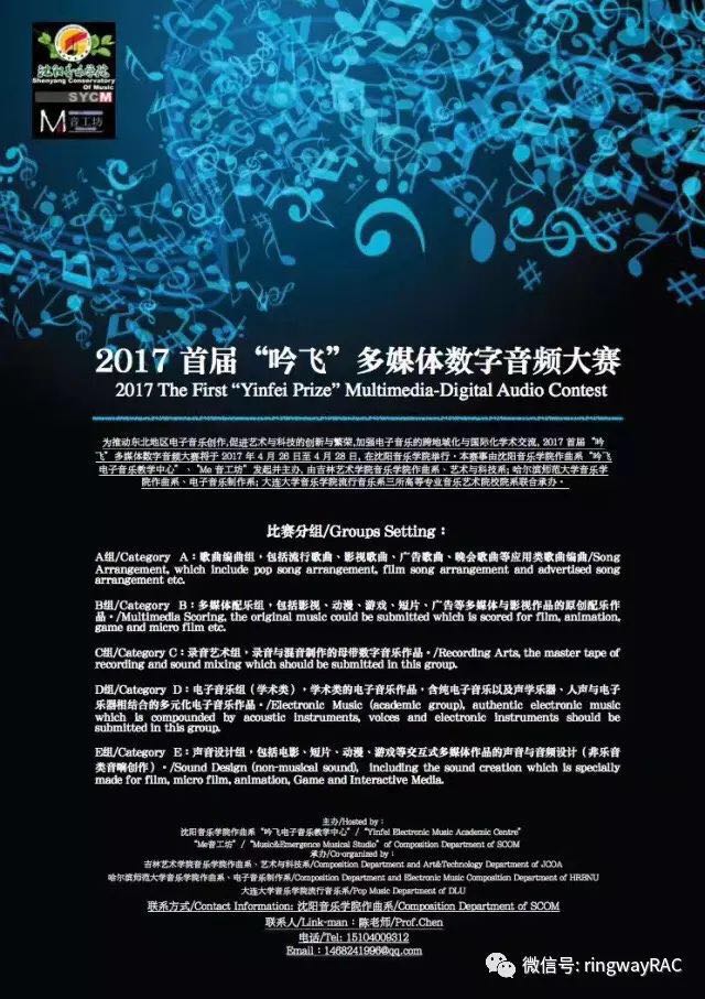 本次大賽由沈陽音樂學院作曲系“吟飛電子音樂教學中心”、“Me音工坊”主辦;吉林藝術學院作曲系、藝術與科技系,哈爾濱師范⼤學音樂學院作曲系、電子音樂制作系,大連大學音樂學院流行音樂系聯合承辦。大賽分為歌曲編曲、多媒體配樂、錄⾳藝術、電子音樂、聲音設計五個組別。