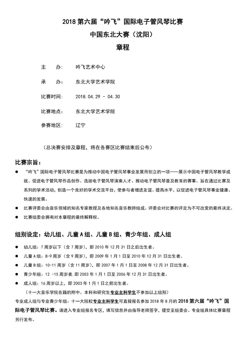 2018第六屆“吟飛”國際電子管風琴比賽中國東北大賽(沈陽)賽區參賽指南和詳細賽程稍后也將發布,請隨時關注“吟飛科技(江蘇)有限公司官網m.ascottmeilun.cn”和“吟飛藝術中心”微信公眾號。