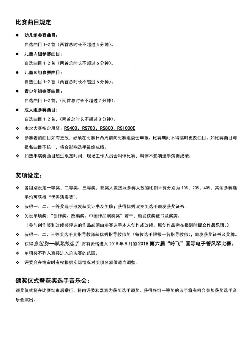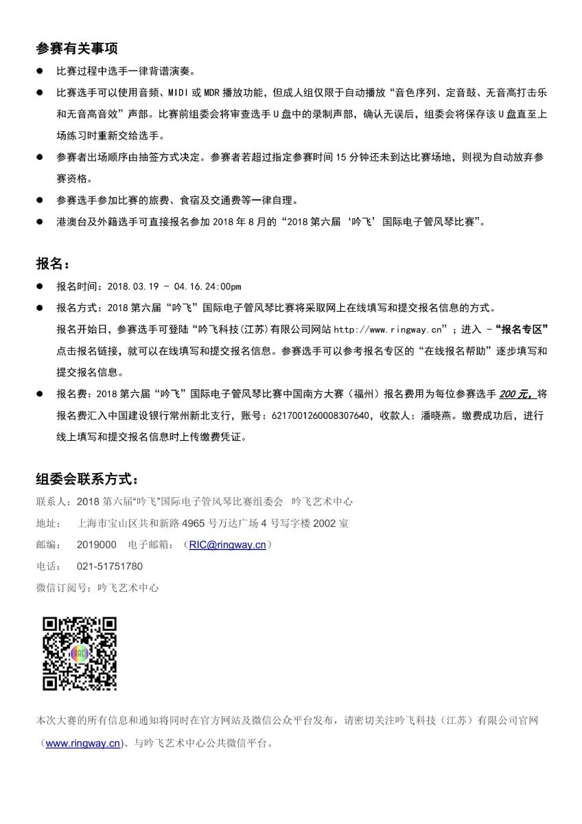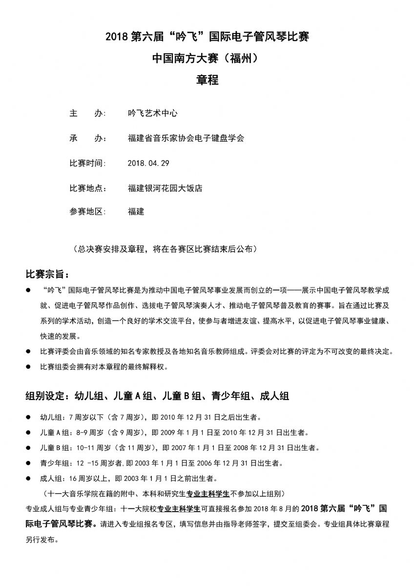 2018第六屆“吟飛”國際電子管風琴比賽中國南方大賽(福州)賽區(qū)參賽指南和詳細賽程稍后也將發(fā)布,請隨時關(guān)注“吟飛科技(江蘇)有限公司官網(wǎng)m.ascottmeilun.cn”和“吟飛藝術(shù)中心”微信公眾號。