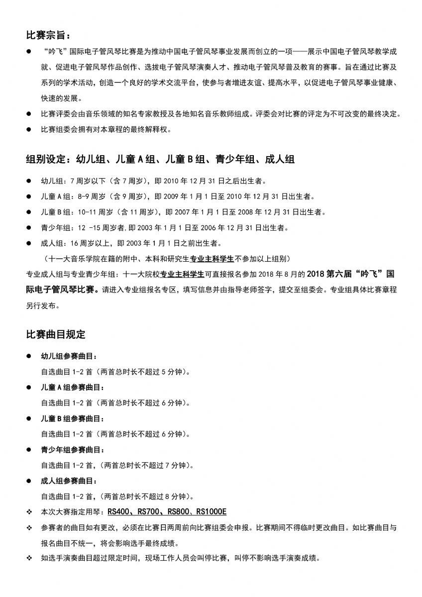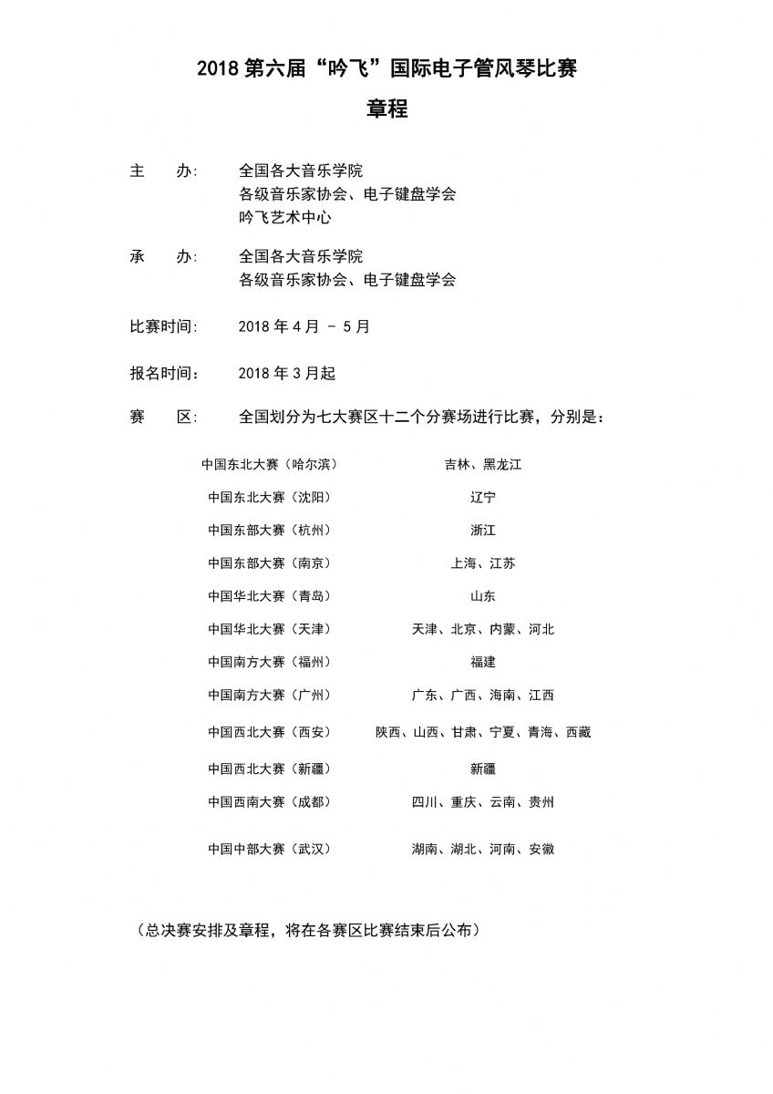 2018第六屆“吟飛”國際電子管風琴比賽即將拉開帷幕,七大賽區12個分賽場的比賽,將于4—5月舉辦,以下為比賽章程,請各位參加比賽的選手認真閱讀,認真備賽,祝愿每位選手能夠獲得理想的成績。