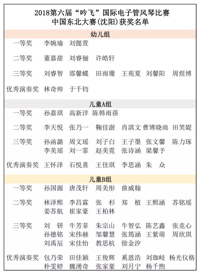【獲獎名單·沈陽】2018第六屆“吟飛”國際電子管風(fēng)琴比賽