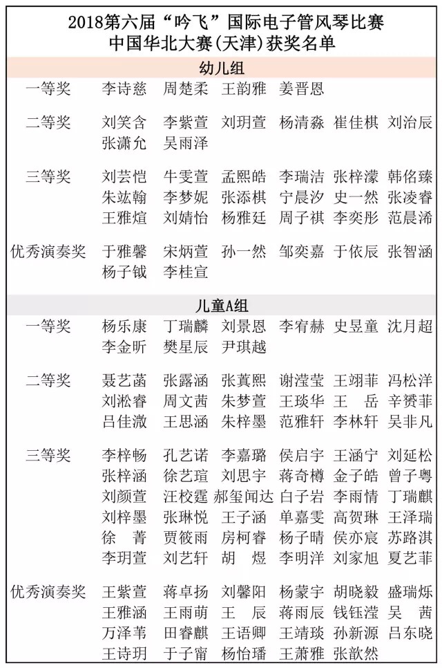 【獲獎名單·天津】2018第六屆“吟飛”國際電子管風琴比賽