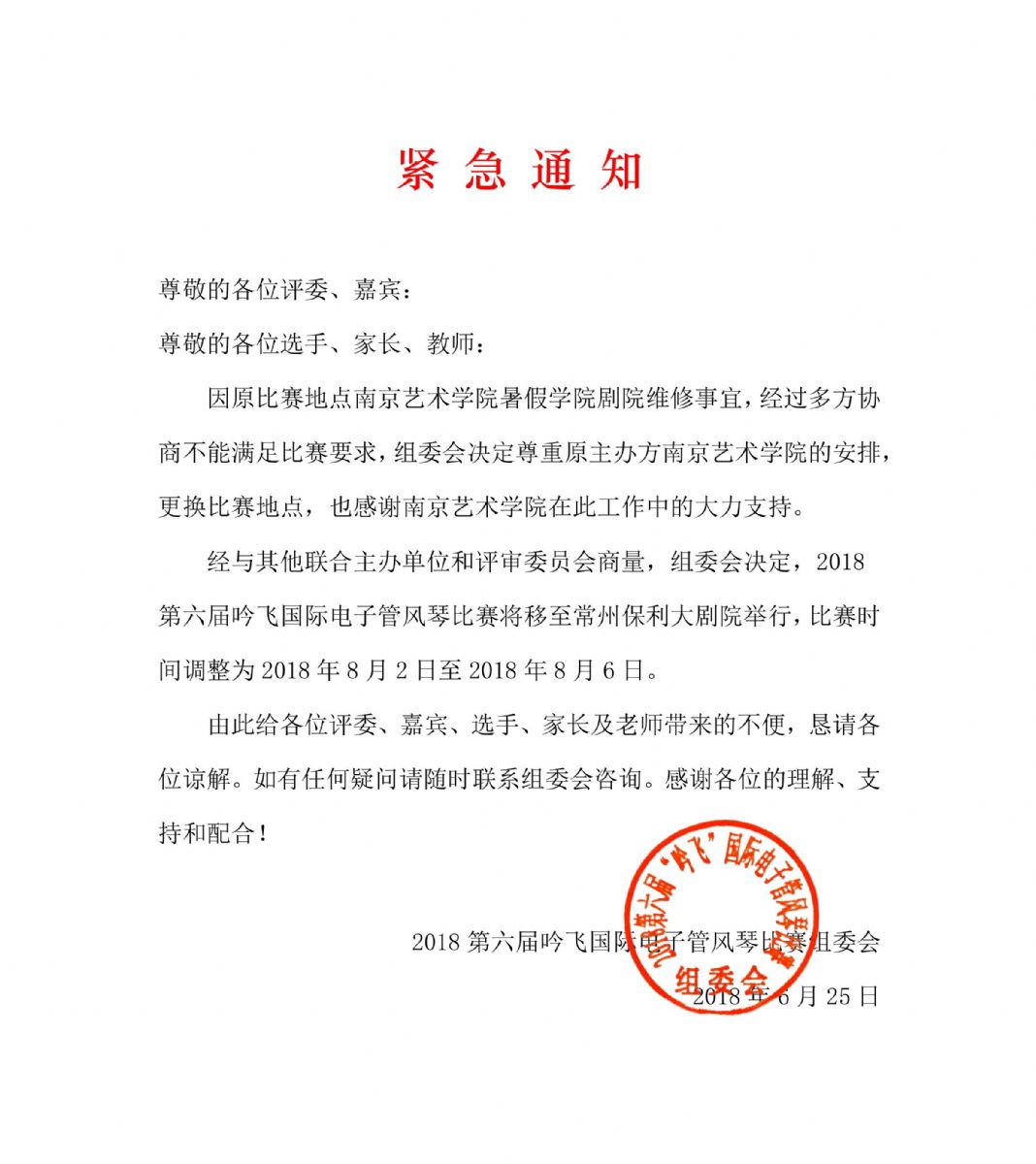 聯系人:2018第六屆“吟飛”國際電子管風琴比賽組委會 吟飛藝術中心