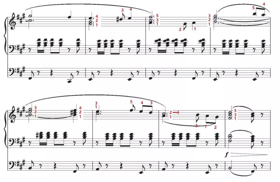 上圖橘色方框內(nèi)容是本曲的難點,演奏時手腕不要以每個音為一個單位進行運動,而要將每個音組作為一個單位來演奏, 即每個紫色圓圈是一個動作。還記得我們之前說過的嗎?多發(fā)揮手指和手腕的作用,手臂放松,少動或不動。