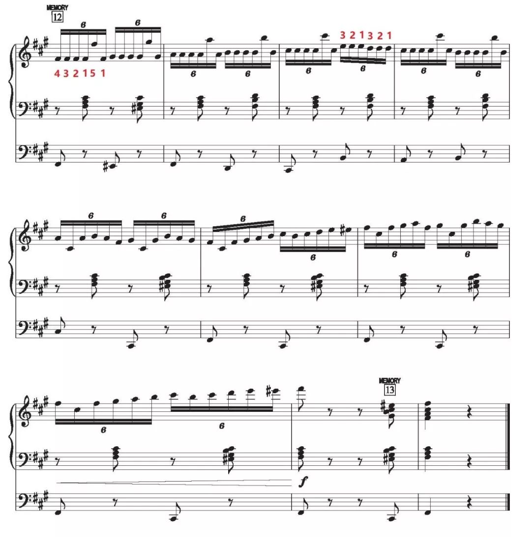 圖3中的同音重復(fù)用輪指演奏更加容易,就好像在腳鍵盤的同音重復(fù)中,我們會使用腳尖、腳跟交替演奏一樣。另外,建議用跳音的方式練習(xí)右手的16分音符6連音,練習(xí)后的成效絕.對會令你驚訝!